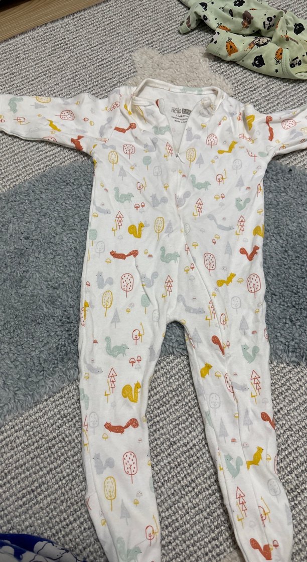 Pamuklu, uzun kollu ve yüksek yakalı erkek bebek tulumu. Örme dokusu ve hayvanlarla ağaç desenleriyle süslenmiştir. Gri tonlarda normcore tarzı.