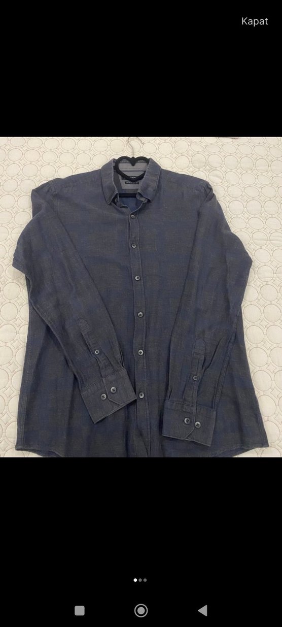 Düğmeli, yakalı ve uzun kollu erkek gömleği. Yumuşak keten kumaştan, gri renkte ve ofis kullanımı için uygun.