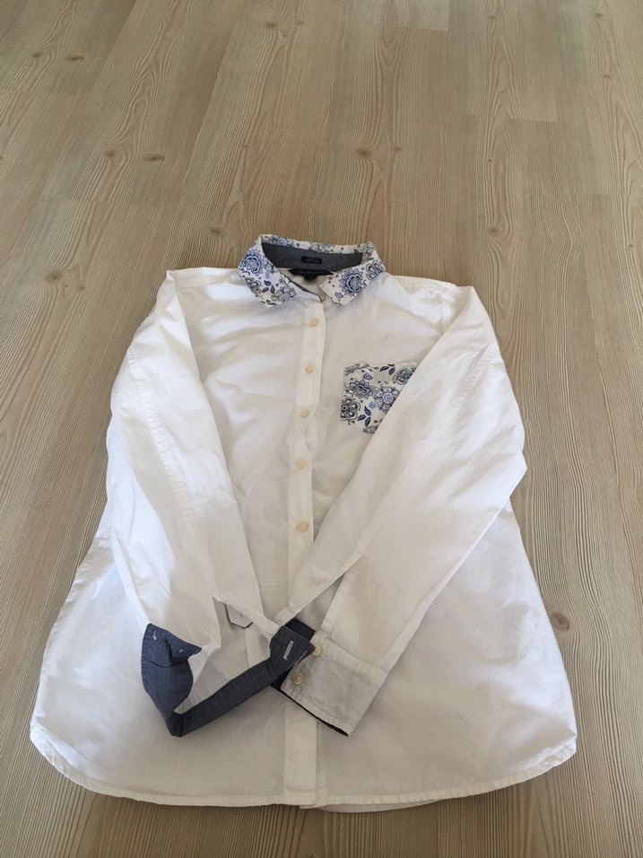 Pamuklu, düğmeli ve uzun kollu beyaz gömlek, yakada ve cepte gri çiçek desenli detaylarla casual stil için uygun.