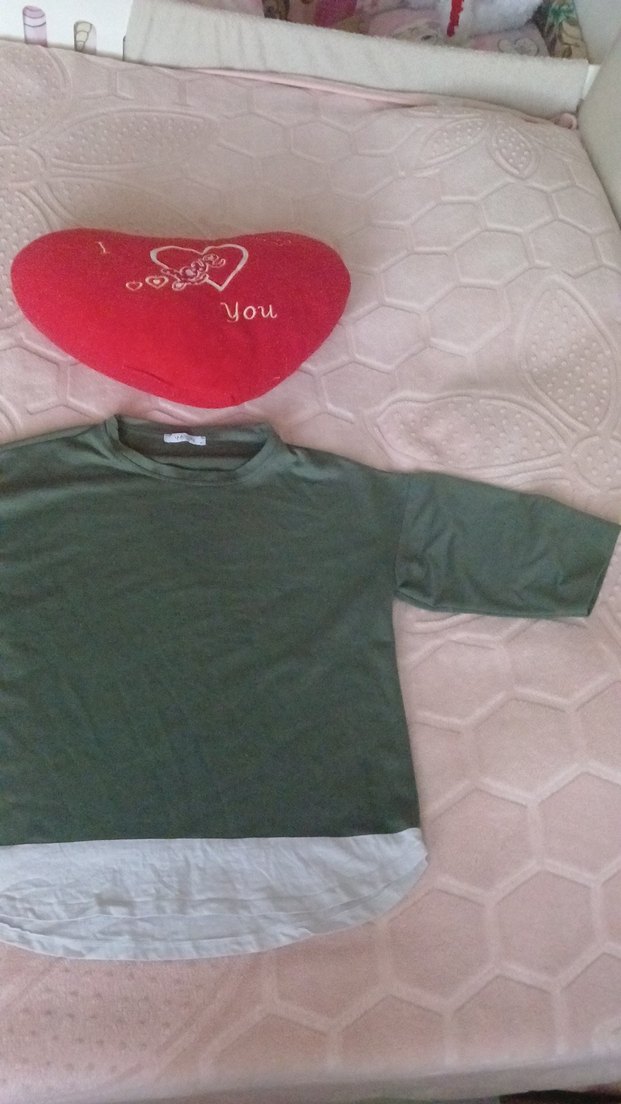 Pamuklu, uzun kollu, yuvarlak yakalı yeşil tişörtü. Gri baskılı desenli, rahat midi boy, günlük kullanıma uygun.