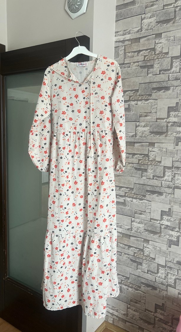 Pamuklu, uzun ve bol kesim elbise, V yakalı ve drapeli tasarıma sahiptir. Beyaz zemin üzerinde canlı çiçek baskılı, rahat bohem stilindedir.