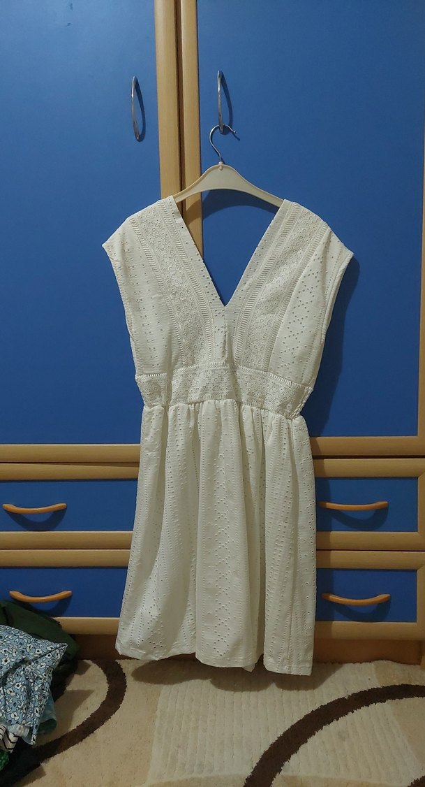 Pamuklu, V yakalı ve askılı beyaz bohem midi elbise, bol kesim ve drapeli detaylarla günlük kullanım için uygundur.