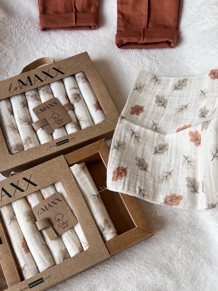 Pamuklu, yaprak desenli ve sonbahar tonlarında yumuşak müslin bebek ağız mendili. 7lidir. İnstagram hesabımızdan detaylı inceleyebilirsiniz. @minizebaby