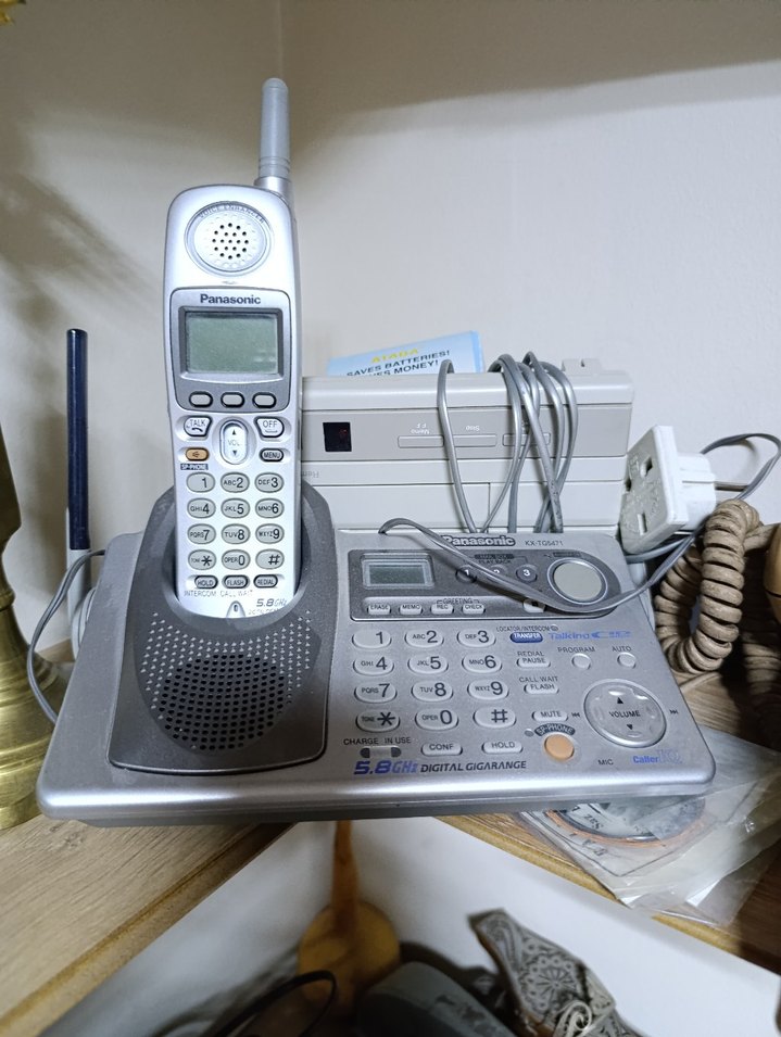 Panasonic markalı gri kablosuz ev telefonu, tuş takımı, hoparlör ve dijital ekran içeren baz ünitesi ile birlikte. Sinyal için anten mevcuttur.