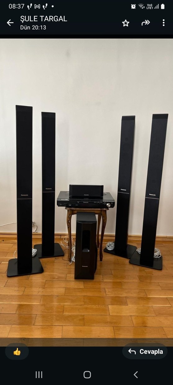Panasonic siyah ev sinema ses sistemi, dört uzun hoparlör, subwoofer ve merkezi kontrol ünitesi ile. Şık koyu tasarım, gelişmiş ses deneyimi sağlar. yanında 37 ekran tv hediye✅️