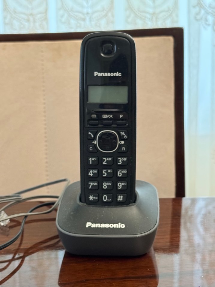 Küçük ekranlı ve tuş takımlı siyah Panasonic kablosuz telefon, şarj istasyonunda duruyor.