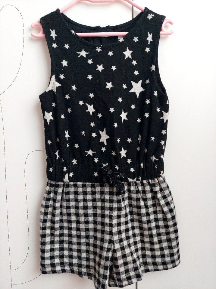 Panço marka, 4-5 Yaş, sırttan fermuarlı, üst kısmı yıldızlı, alt kısmı ekoseli kız çocuk tulum. Belinde simli minik bir fiyonk detayı var. İçi terletmeyen ve kaşındırmayan kumaştan üretilmiş.