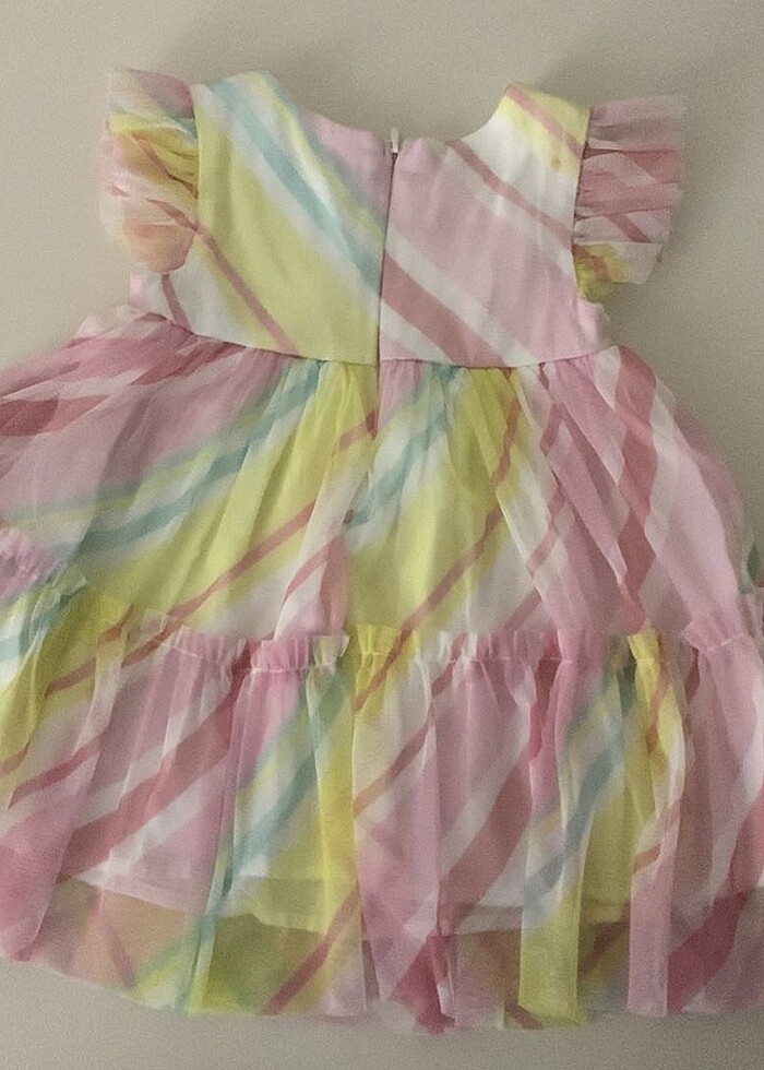 Sadece 2 defa kullanıldı. İki minik yerinde mandal dolayısıyla pas lekesi var fakat astarında gözükmüyor kolları fırfırlı ve içi beyaz keten astarlı dışı renkli tül