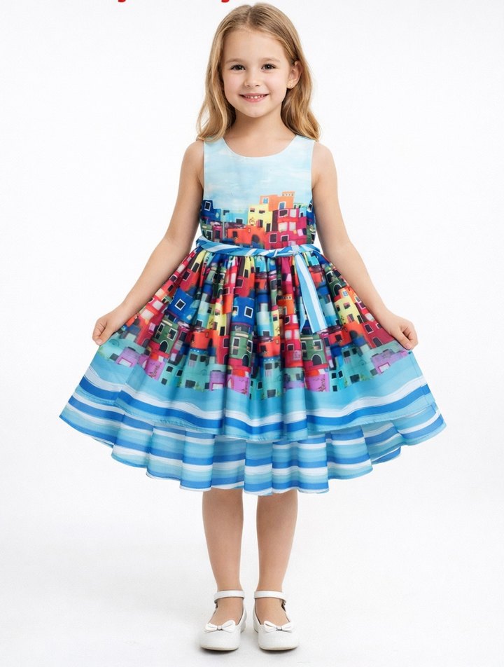 Renkli pop art desenli, salaş kesim ve kolsuz tasarıma sahip kız elbisesi, yumuşak sentetik kumaştan üretilmiştir.