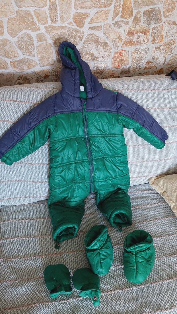 Koyu yeşil ve lacivert kapüşonlu, fermuarlı bebek tulumu. Yumuşak ve sıcak kumaştan. Eldiven ve patik setiyle birlikte. ❄️ 6 - 12 aylık