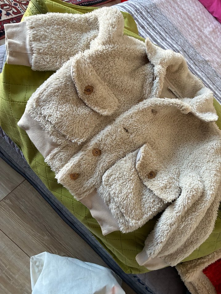 Kapüşonlu, geniş kesim gri renkli erkek çocuk montu, yumuşak peluş kumaştan ve düğmeli ceplerle detaylandırılmış.