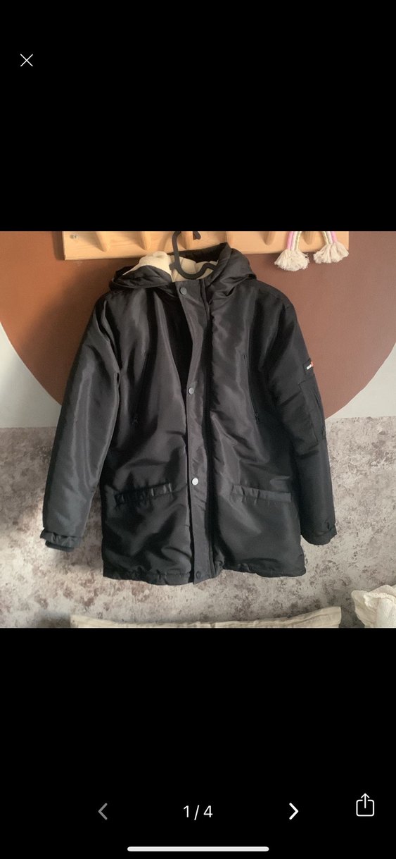 Siyah kapüşonlu kadın mont, uzun kollu ve bol kesimdir. Yumuşak ve sıcak kumaştan olup kürk detayları içerir, günlük kullanım için uygundur.