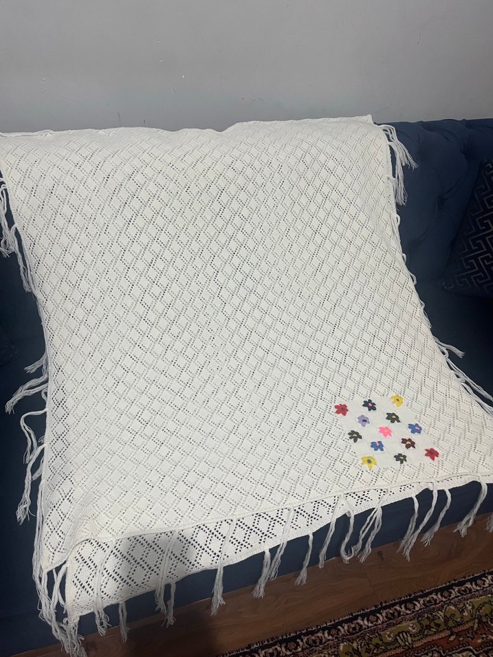 Beyaz işlemeli desenli, püsküllü kenarlara sahip panço Köşesinde renkli çiçek nakışı bulunur. Yumuşak ve hafif kumaşlıdır.