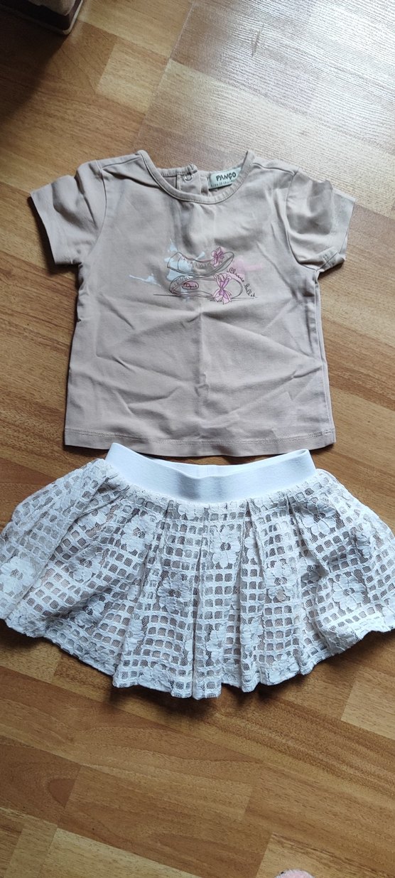 Kısa kollu bej bluz üzerinde nakış detayları ve yumuşak bel bantlı gri dantelli etekten oluşan kız bebek takım. eteğin içinde astarı ve %100 pamuk kumaştır. önden tam orta kısımdan etek üçüne 22 cm boyu
