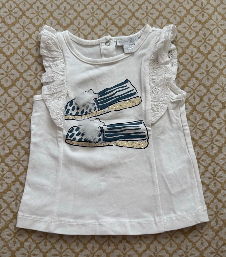Beyaz pamuk kısa kollu kız çocuk tişörtü, fırfırlı kol detayları ve ayakkabı baskısı ile. Birkez giymiştir belki hatırlamıyorum hiç dolapta unutulanlardan çok şık bir tshirt