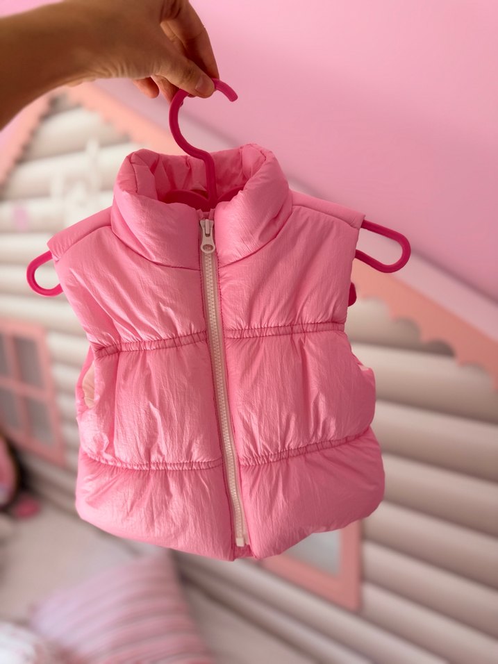 Kız çocukları için fermuarlı, yüksek yakalı, pembe renkli, yumuşak kumaştan yapılmış, fit kesim ve kolsuz yelek. Pastel tonlarda, sokak stiline uygun.6-12 ay.