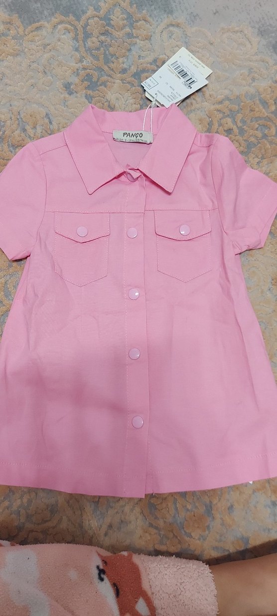 Panço etiketli, pastel pembe kız çocuk gömlek. Kısa kollu, çıtçıtlı ve notalı yaka detaylı, düz ve rahat kesim.
