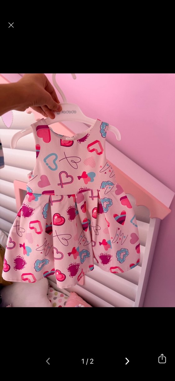 Kolsuz, V yaka ve fırfır detaylı pembe elbise. Sentetik kumaştan üretilmiş, renkli kalp desenleriyle süslenmiş, trend görünüm için ideal. Kızım 1 kere giydi. 9-12 ay.