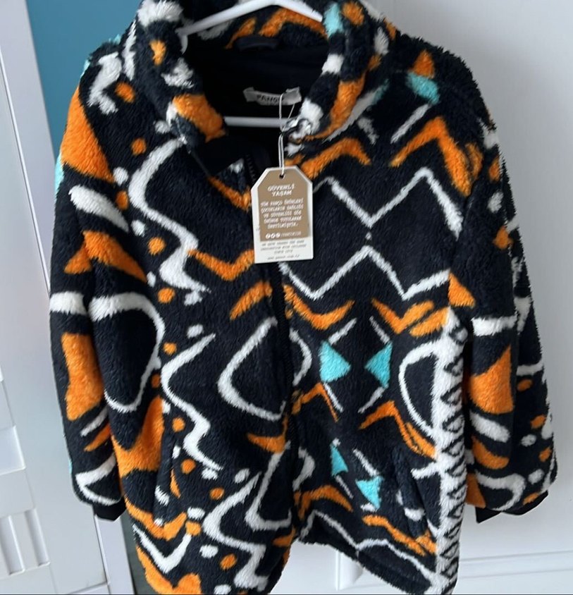 Bol kesim, çok renkli erkek çocuk pelüş mont. Kürklü detaylarıyla sıcak ve rahat bir kullanım sunar.