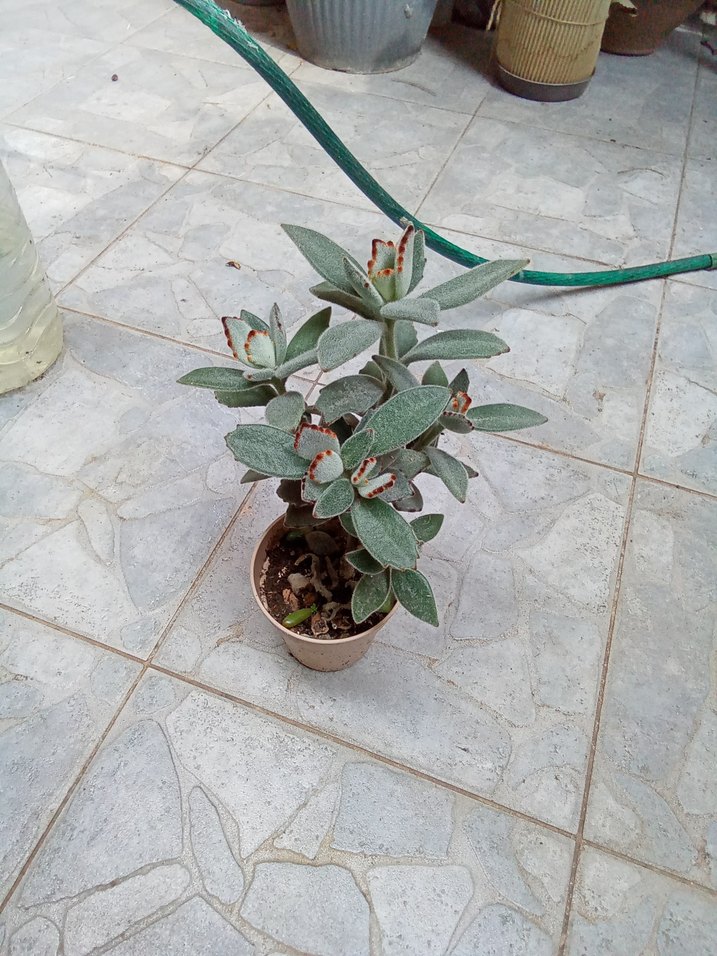 kalanşo cinsi gri yaprakları ve kırmızı kenarları olan küçük, tüylü sukulent bitki, iç veya dış dekorasyon için saksıda.