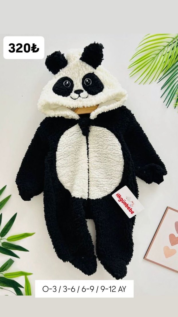 Yumuşak ve sıcak kumaştan yapılmış, kapüşonlu ve kulaklı panda desenli bebek tulumu. Koyu renkte, soğuk hava için uygundur.
