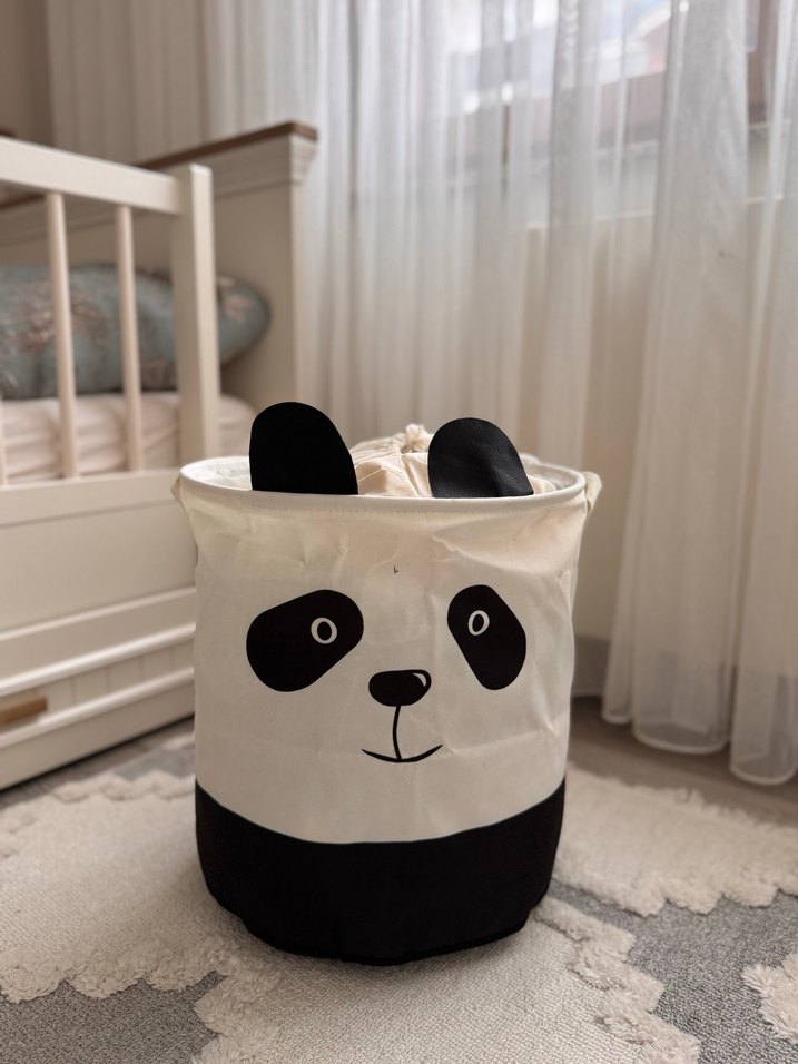 Koyu kulakları ve tabanı olan panda yüzü desenli beyaz saklama sepeti. Hafif yapısı ile eşyalarınızı düzenlemek için uygundur. Üründe arka kısmında hafif defo vardır