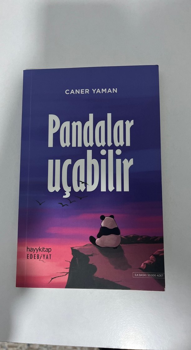 Caner Yaman'ın "Pandalar Uçabilir" adlı romanı, gün batımında uçurumda oturan düşünceli bir pandayı konu alıyor.