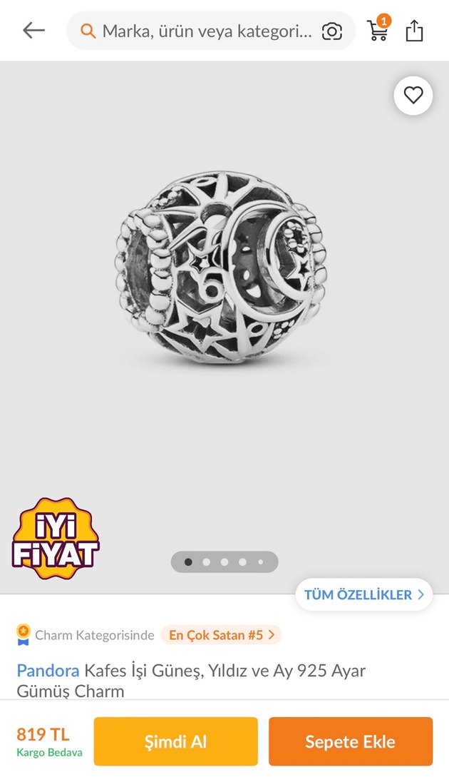 925 ayar gümüşten yapılmış, güneş, yıldız ve ay desenli Pandora charm. Orijinal sorunsuz