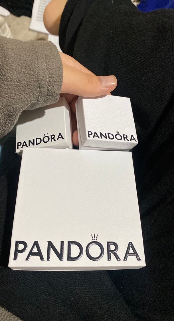 Farklı boyutlarda beyaz Pandora hediye kutusu seti, her kutuda marka logosu bulunur. Takı saklama ve sunumu için uygun.