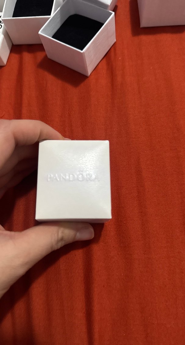 Pandora markasının kabartmalı yazılı olduğu beyaz küçük kutu, sabun veya küçük ürünler için uygun.