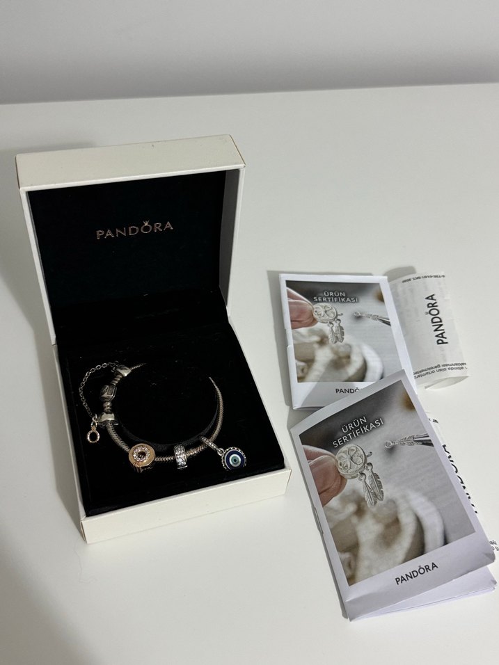 Pandora kadın bileklik 3 charm (nazar boncuğu, parlak taşlı,rose gold hepsi seri değerli charm modeliydi) ve koruma bağlantısı hepsini beraber satıyorum ayrı ayrı zamanlarda alinmisti ürünlerin ayrı sertifikaları mevcuttur kutulu gönderilecek bir süre kullandım ürünü