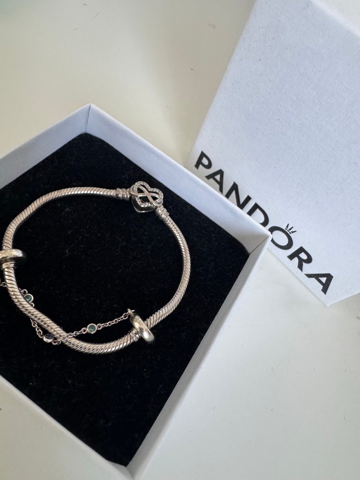 Pandora bileklik, yılan desenli altın zincir detaylarıyla günlük kullanıma uygun bohem tarzda bir aksesuardır. • %100 orijinal Pandora sonsuzluk kilitli bileklik. • Bileklikle birlikte, taş detaylı güvenlik zinciri ve iki adet ayraç (spacer) boncuk gönderilecektir. • Bilekliğin temizliği yapılmıştır, hiçbir kararma veya çizik yoktur.