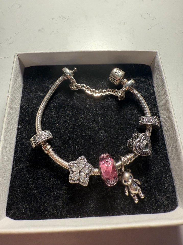 Bir sorunu yok geçen yıl doğum günümde almıştım. Yine de göndermeden önce temizleme suyuyla parlatacağım. Bir orijinal Pandora zinciri, üç tane orijinal Pandora charmı, bir orijinal güvenlik zinciri, iki tane de durdurma charmı bulunuyor (bir de ek olarak cicek seklindeki 1 tane orijinal olmayan charm) pembe Murano nun yanındaki çiçek şeklinde olan orijinal Pandora değil o yüzden bütün bilekliği alana onu yanında hediye vereceğim
