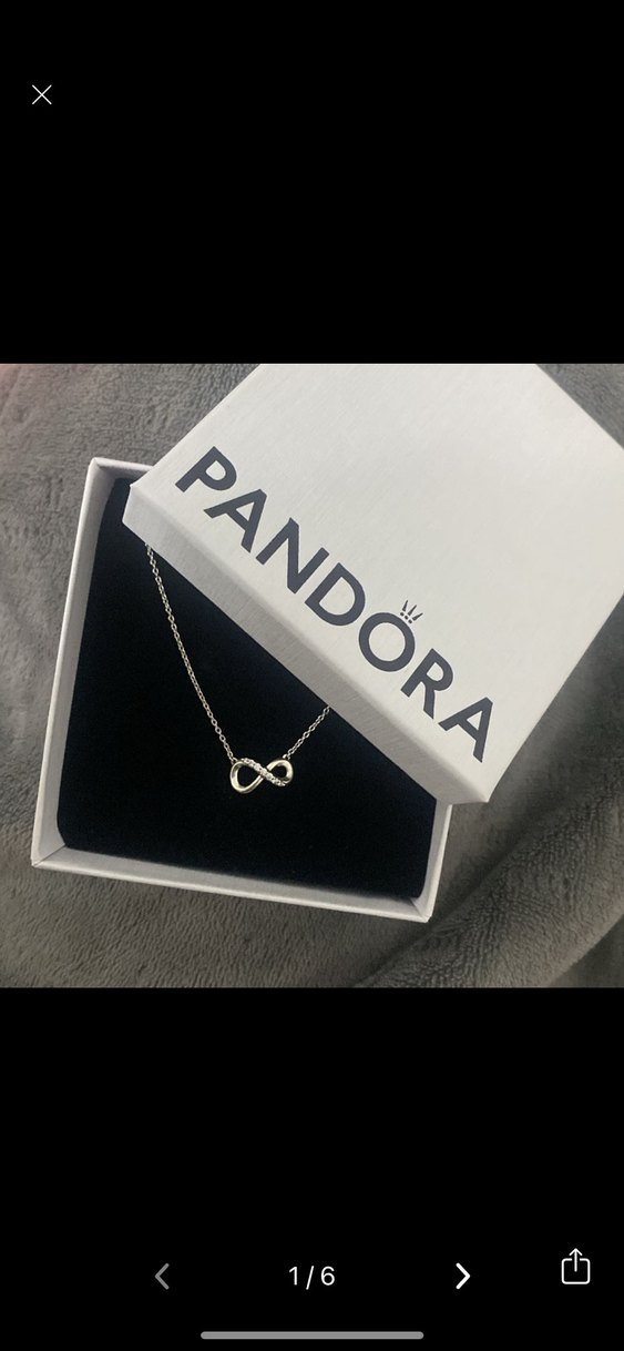 Pandora marka, gümüş renkli zincir ve sonsuzluk sembollü kolye. Minimalist ve çağdaş tasarıma sahip, midi uzunlukta, romantik akşamlar için uygun.