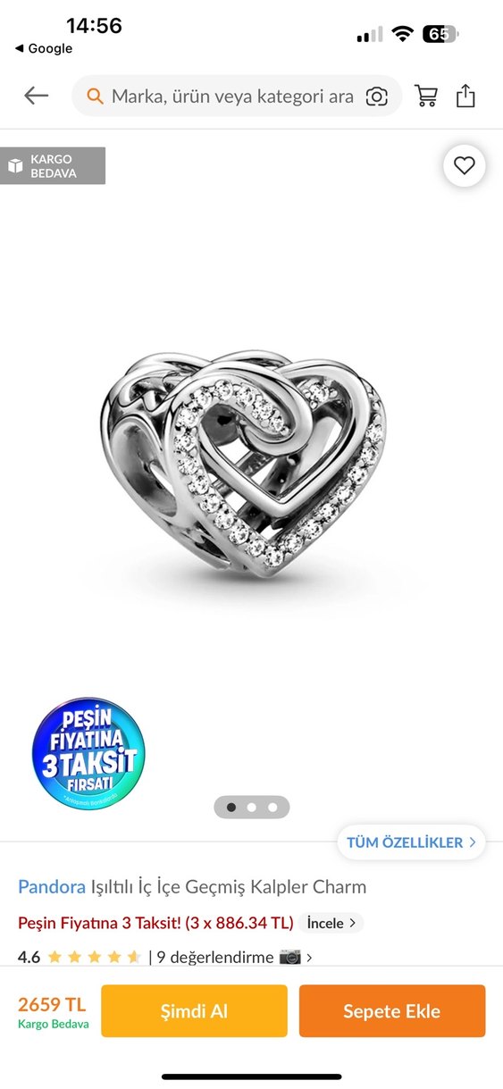Işıltılı boncuklarla süslenmiş iç içe geçmiş kalplerden oluşan Pandora charm, romantik gece için şık ve çağdaş bir tasarıma sahip. Ürün yeniden farksız piyasa değeri 2600 TL tamamen gümüş ve zirkon taşlıdır
