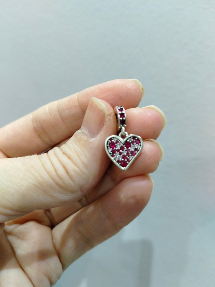 Fuşya ve beyaz taş detaylarıyla kalp şeklinde Pandora charm. 925 ayar gümüş.