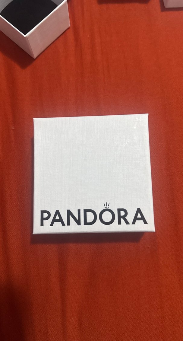 Koyu kırmızı renkte, Pandora logosu bulunan erkek rozeti, sade ve minimal tarzda, normcore görünüm için uygun.