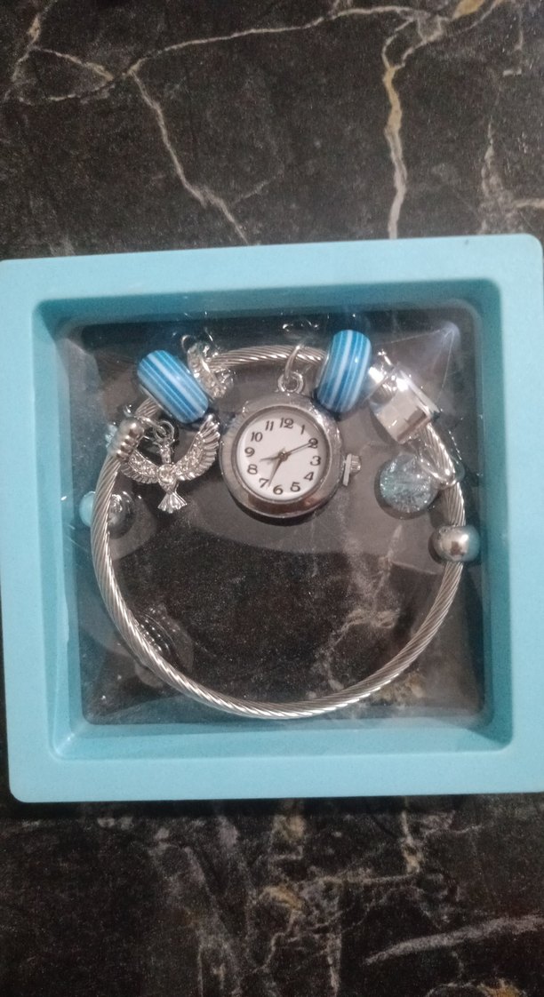 Boncuklu tasarıma sahip gri ve turkuaz tonlarında kadın bileklik, küçük saat ve süs boncukları içerir, günlük kullanım için uygundur. ⌚hediye koyuyorum yanına kutusuyla gelir