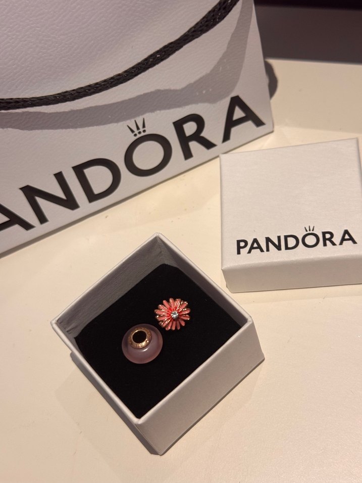 Pembe boncuklu ve çiçek desenli iki Pandora charm içeren set. Günlük kullanım için Paris tarzı normcore şıklığında.