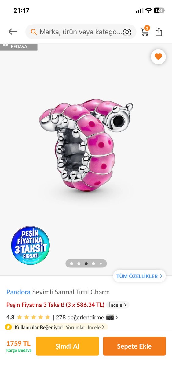 Orijinal pandora tırtıl charmı. Hiçbir sorunu yoktur. Kutusuyla birlikte gönderilecektir.