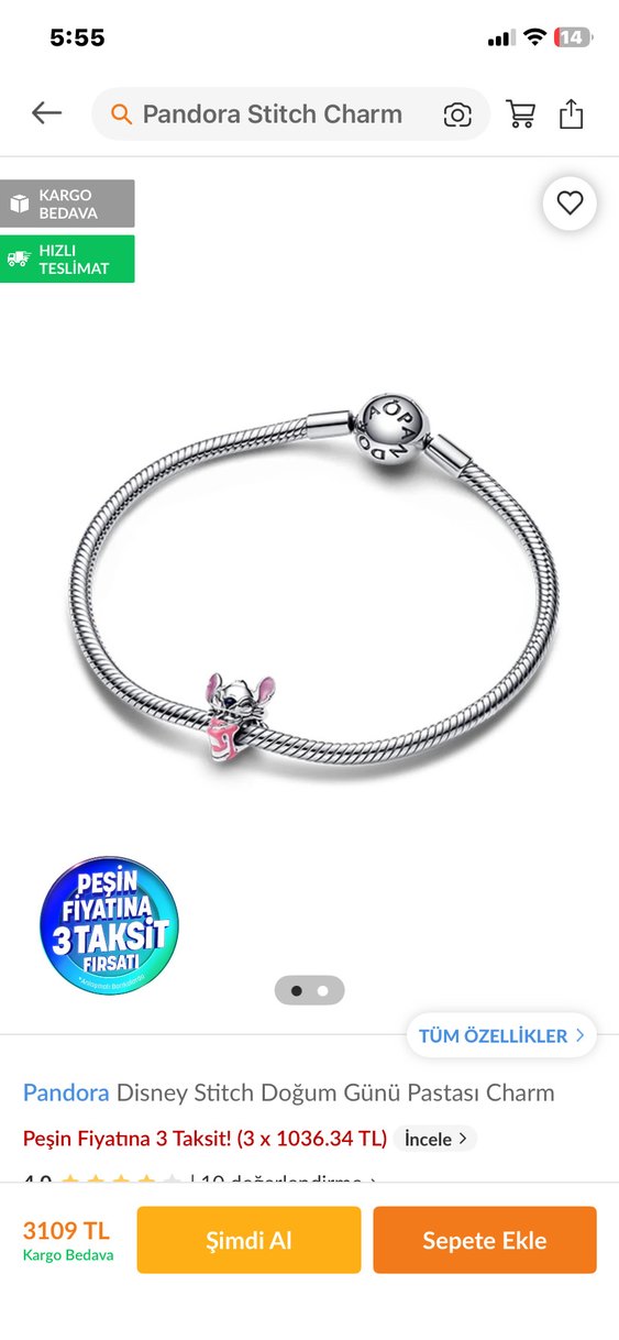 Pandora Pembe Stitch Charm