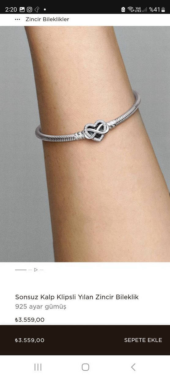 Pandora sonsuz kalp klipsli yılan zincir bileklik Mağazadan satın alınmıştır sorunu yoktur alım fişiyle ve çantasıyla göndereceğim charmı hediye olarak yollayacağım parasıyla kedilere mama alacağım mutluluk getirsin :)