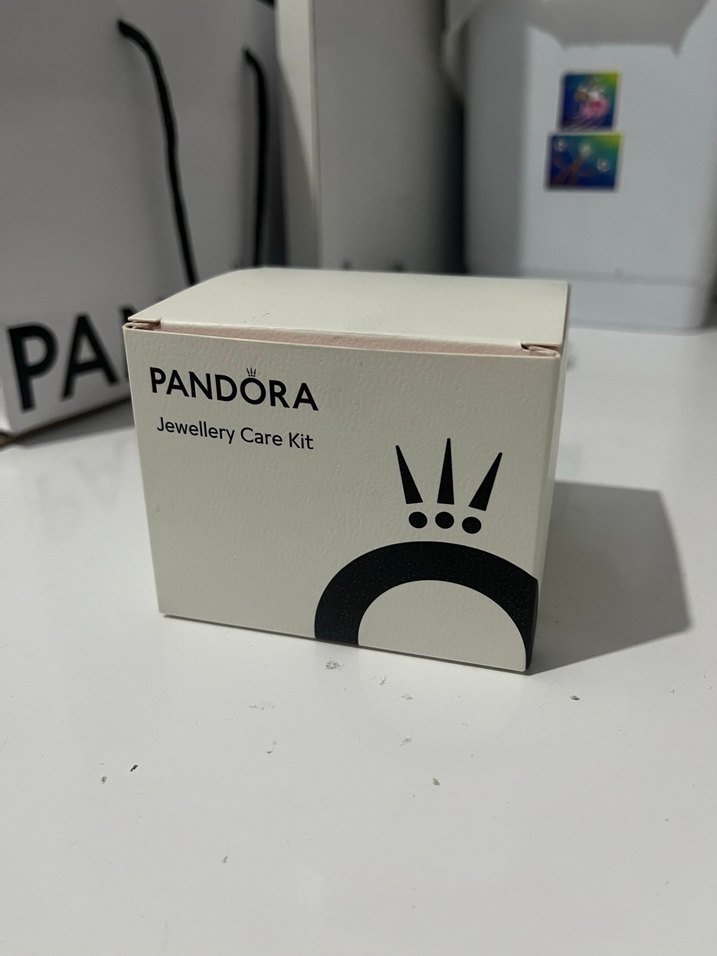 Pandora Takı Bakım Seti, beyaz kutusunda takılarınızı temizlemek ve korumak için gerekli araçları içerir. Takı bakımı için kullanışlıdır.