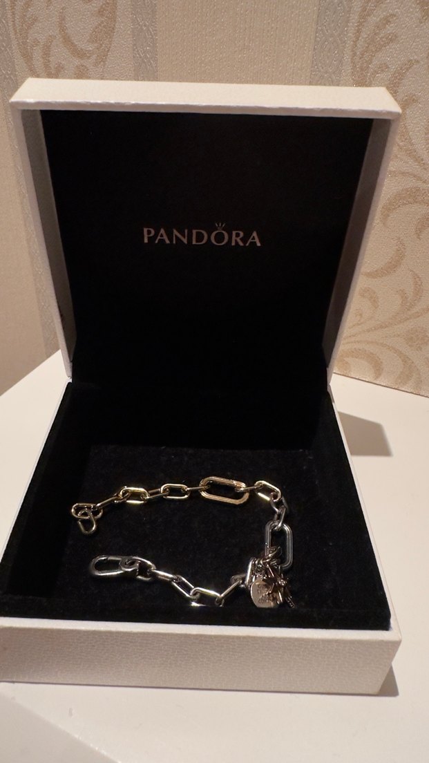 Pandora markalı, çağdaş tarzda, zincir detaylı altın bileklik. Romantik akşamlar için uygun. ✨