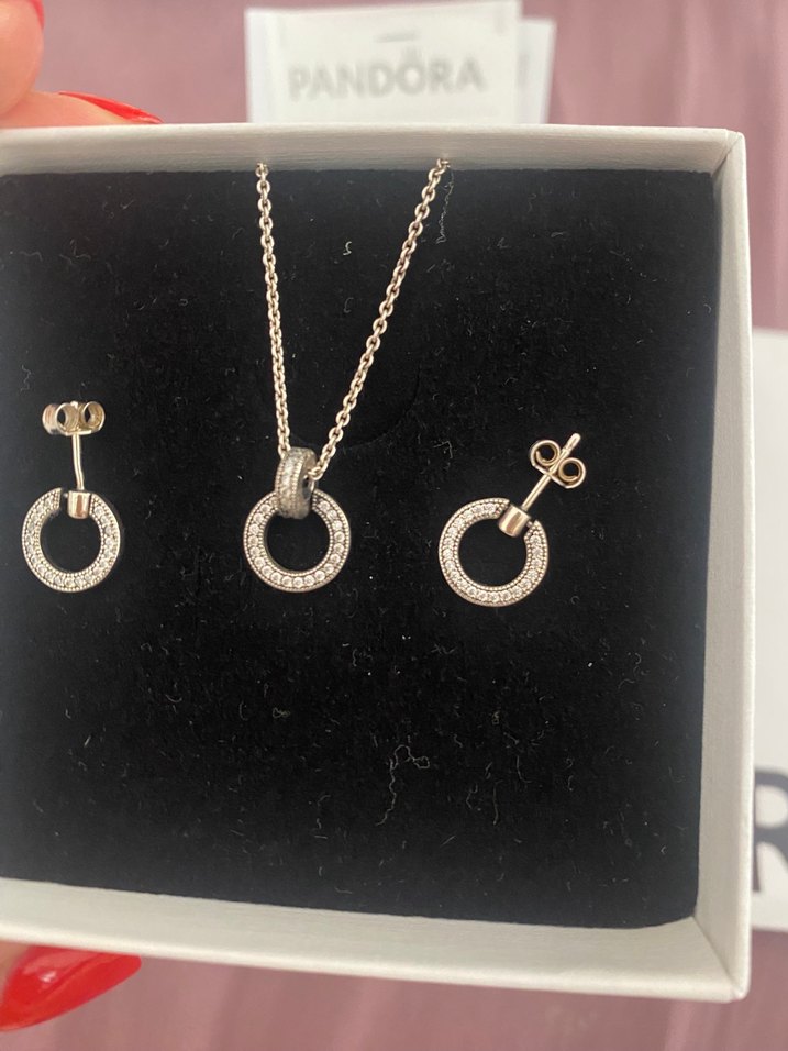 Pandora zincir detaylı kolye ve küpe seti, günlük kullanıma uygun zarif tasarım sunar. Pandora bileklik ve charmla takas yapılabilir