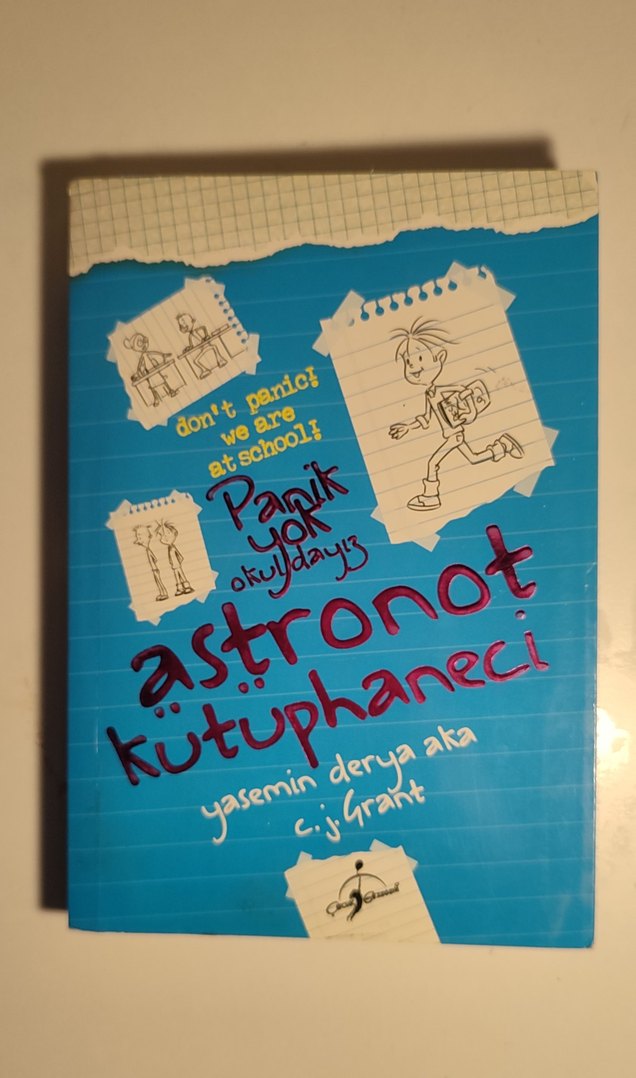 Yasemin Derya Aka ve C.J. Grant'in yazdığı, okul ve mizah temalı 'Panik Yok Okuldayız - Astronot Kütüphaneci' kitabı. Eğlenceli çizimler içerir.