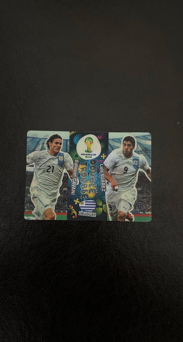 KONDİSYONU ÇOK İYİDİR ÇİFT TARAFLI ÇİFT GÖRÜNTÜLÜ KARTTIR Uruguay futbolcuları Edinson Cavani ve Luis Suarez'in yer aldığı parlak siyah erkek sade ve athleisure tarzında.