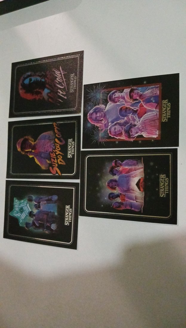 Stranger Things temalı, karanlık arka planlı ve çok renkli karakter kartları seti.