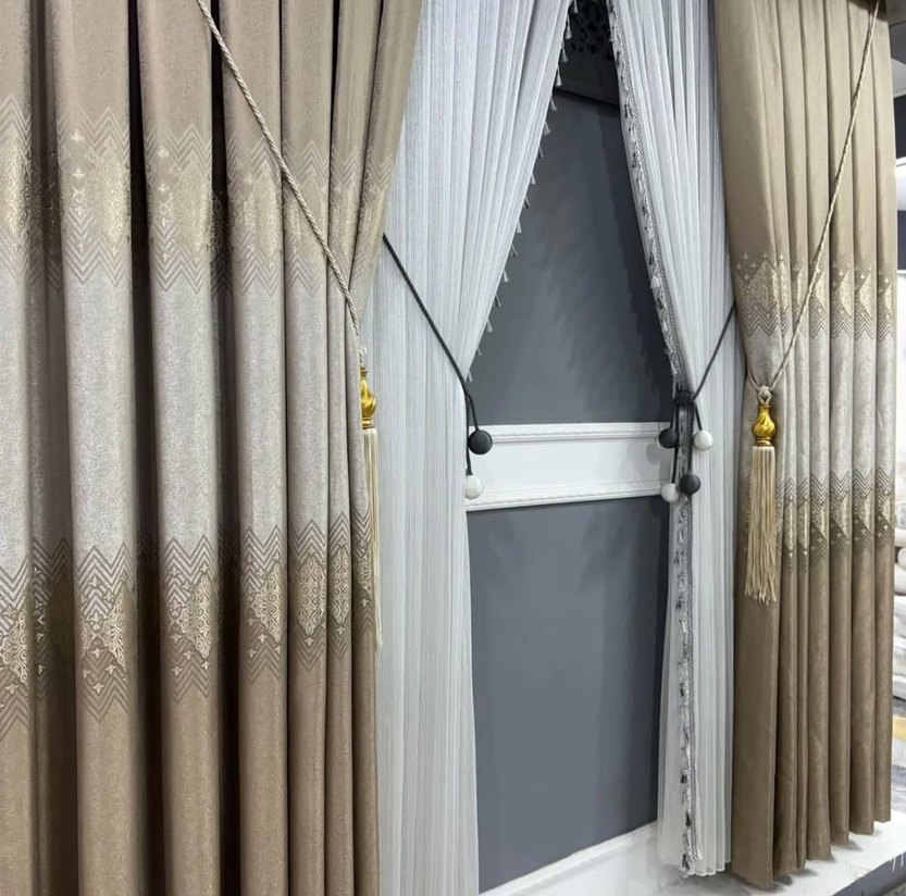 Bej renkte nakışlı desenlerle gri detaylara sahip, modern klasik tarzda perde. Püsküllü bağlama ipleriyle şık bir görünüm sunar.