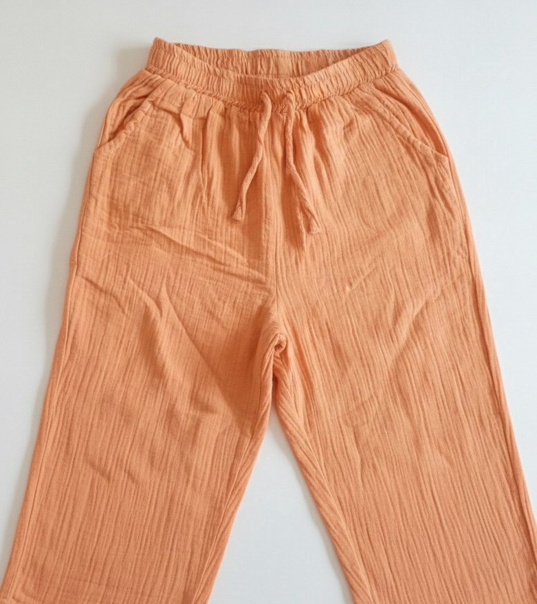 Salaş kesim, keten kumaştan yapılmış, beli bağcıklı ve cepli turuncu pantolon. Günlük kullanım için rahat ve şık, midi boyda,
